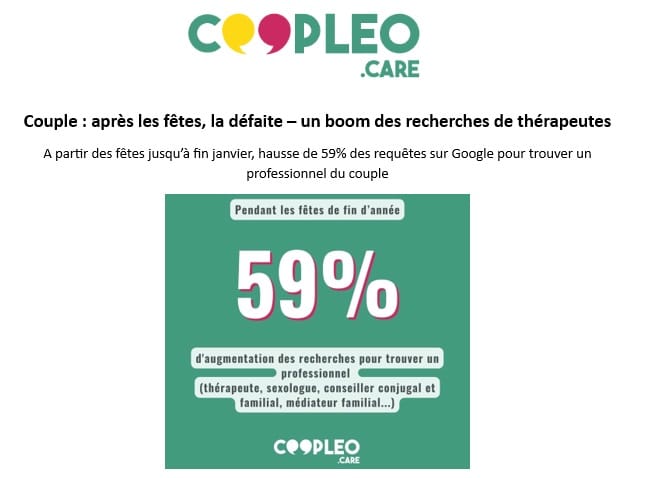 coopleo.care, la première plateforme de mise en relation 100% dédiée à la santé conjugale et familiale, annonce que le mois de janvier voit exploser la demande pour trouver un professionnel du couple (thérapeute, conseiller conjugal, sexologue, médiateur familial). En effet, selon Google Trends, une hausse de 59% des requêtes sur Google pour trouver un professionnel du couple est constatée en 2022 à partir des fêtes jusqu’à fin janvier. Ces données sont confirmées par un sondage effectué auprès des professionnels du couple référencés sur coopleo.care.