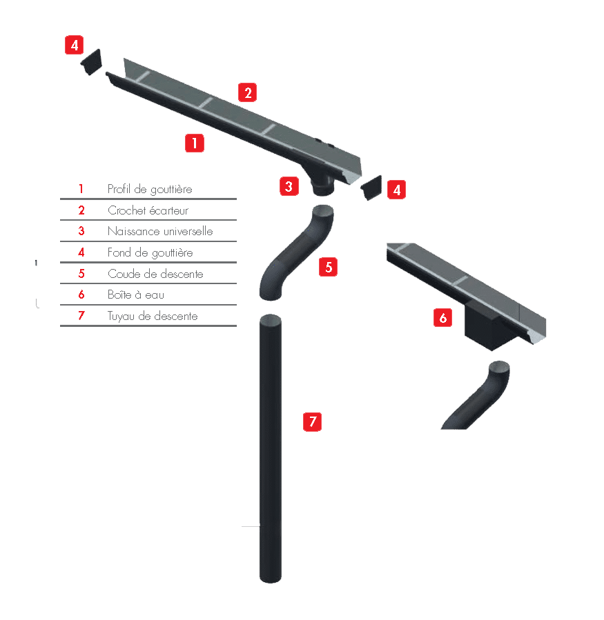 Chaque composant du système G500 respecte les normes en vigueur : NF EN 573-3 (alliages d’aluminium), NF EN 1396 (aluminium prélaqué), NF EN 612 (profils de gouttières métalliques), et NF P 36-201 (systèmes d’évacuation des eaux pluviales). La mise en oeuvre est conforme au DTU 40.5, garantissant une intégration professionnelle, quel que soit le type de toiture.