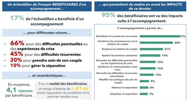 Il est à noter que seuls 10% des couples s’étant fait accompagner ont consulté pour gérer une séparation. 66% voulaient régler des difficultés ponctuelles ou des expériences de crise, 45% des difficultés récurrentes, et 20% souhaitaient prendre soin de leur couple.