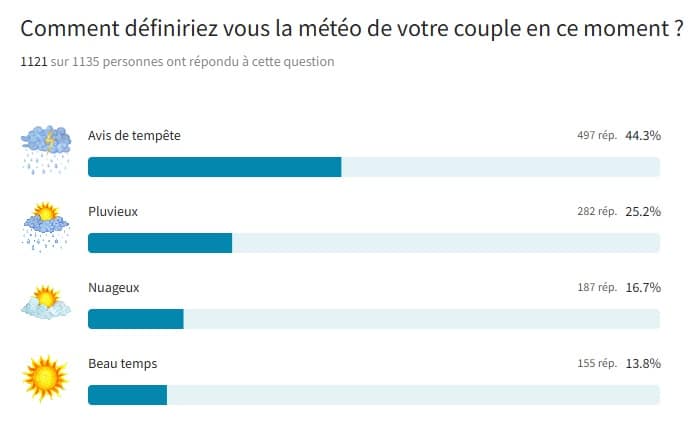 D’autre part, à la question sur la météo de leur couple, 44% répondent être en avis de tempête, 25% la considèrent comme pluvieuse, 17% comme nuageuse et 14% au beau fixe.