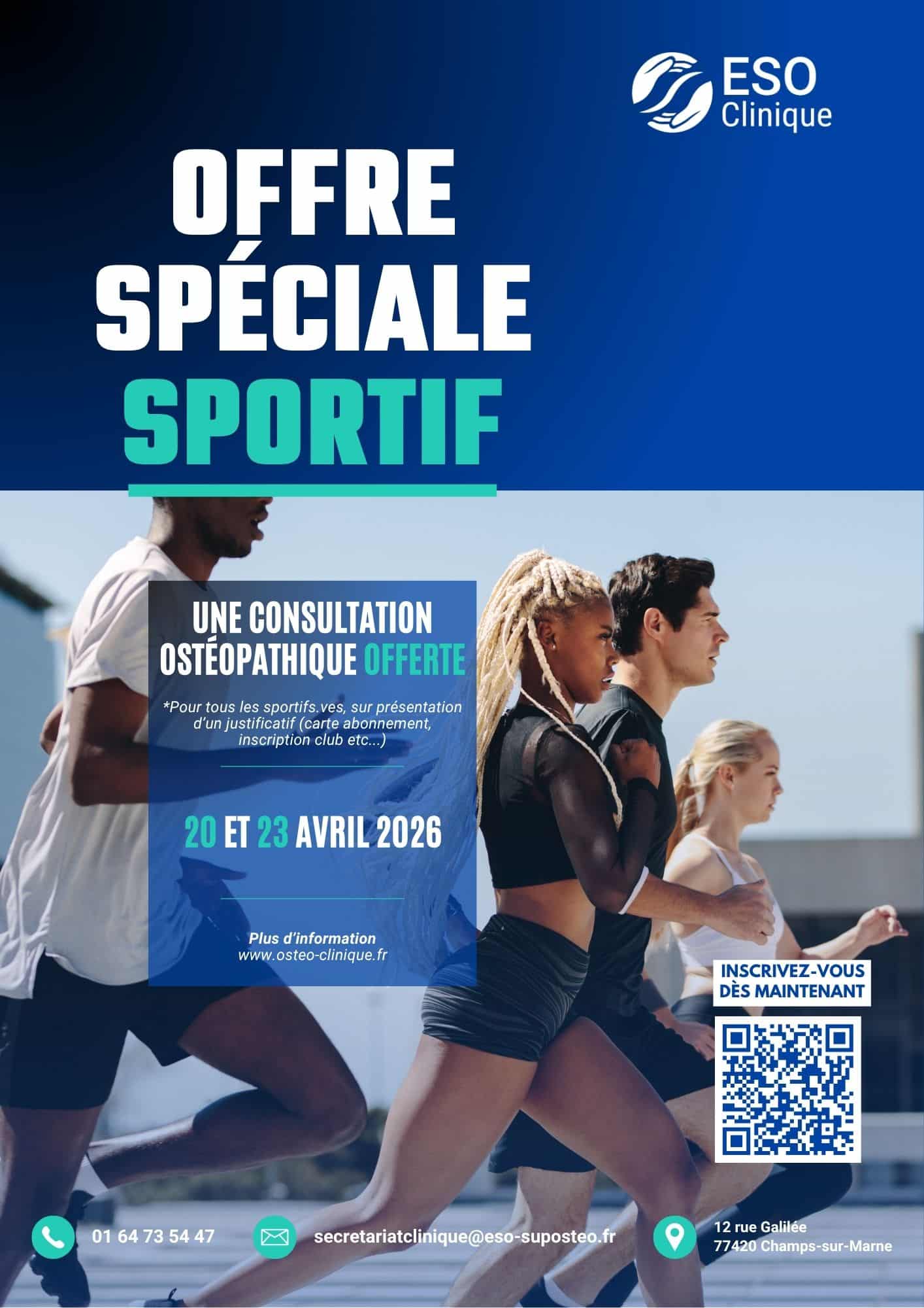 Le lundi 20 avril et le jeudi 23 avril 2026, la Clinique Ostéopathique de l’ESO (77 Champs sur Marne) invite tous les sportifs à prendre rendez-vous pour une consultation ostéopathique offerte.